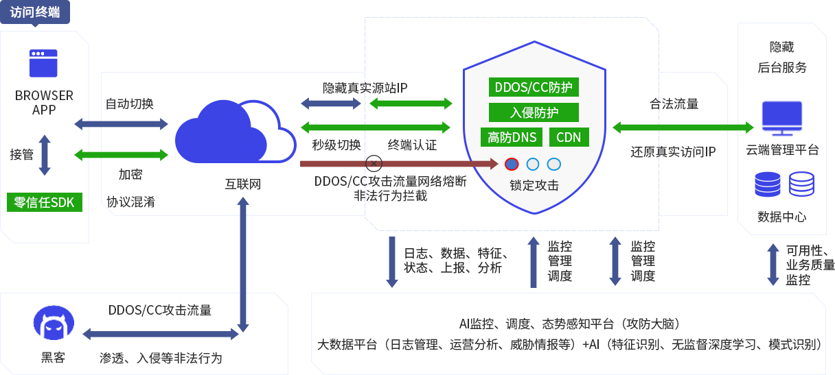 SDK智能毫秒及调度,受攻击时分布式防御无缝重连,业务无感知; 支持受攻击时智能溯源;
